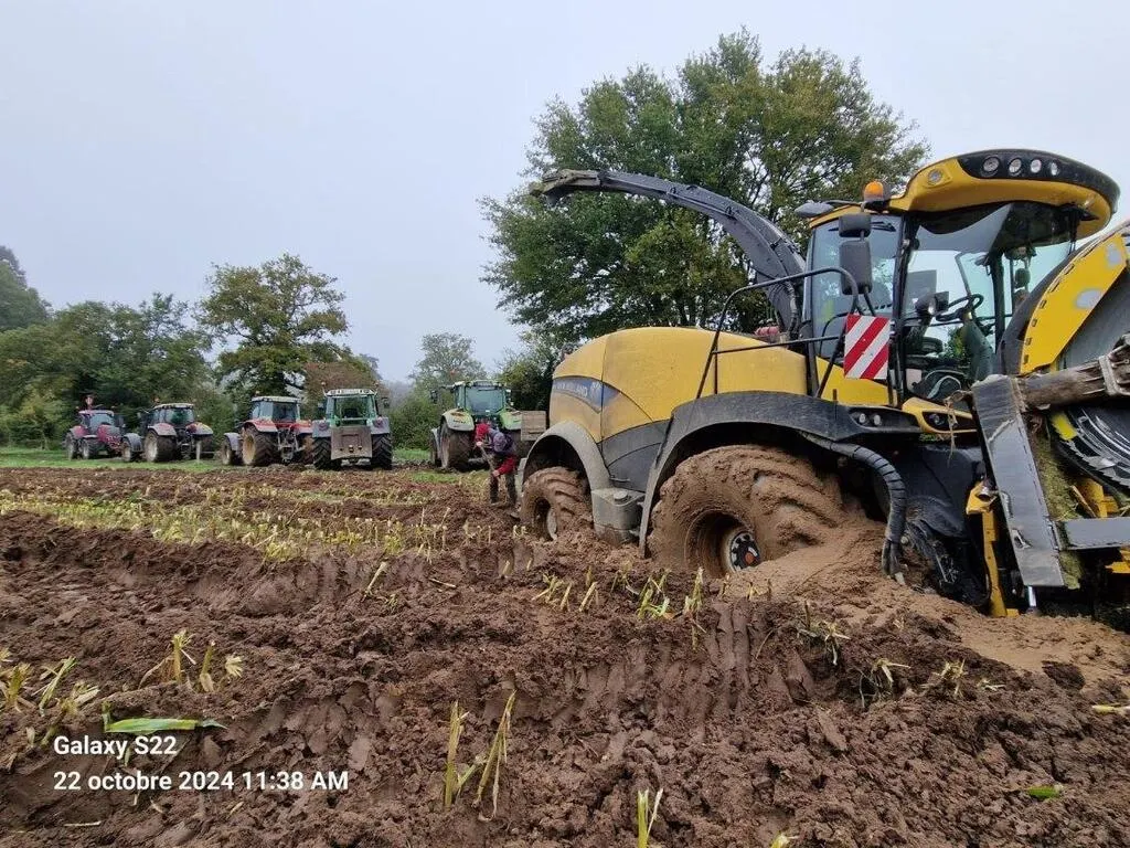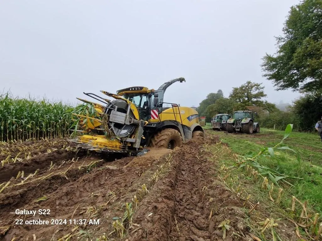 Avec la pluie, on ensile et s’enlise, comme ici dans le Belinois, ce mardi 22 octobre 2024. Il a fallu six tracteurs pour sortir l’ensileuse de son piège de boue. © Ouest-France