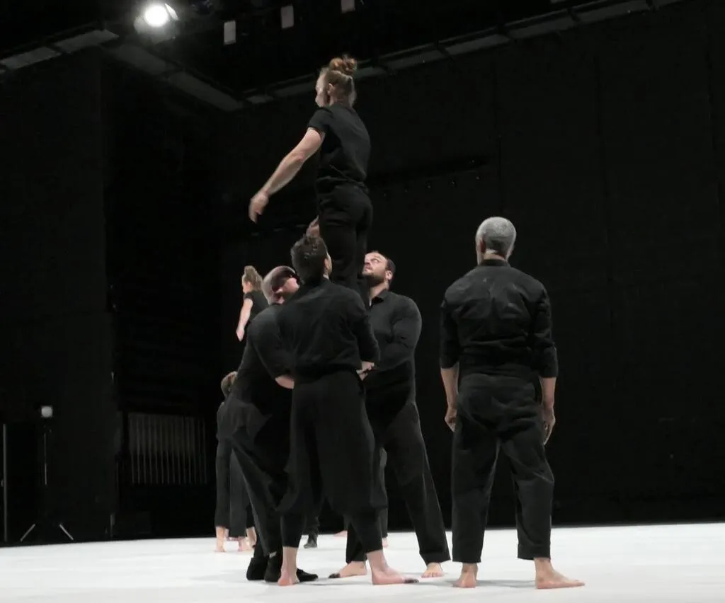 Des duos, des trios éphémères se créent. Certains montent sur les épaules de l’autre. D’autres se rattrapent d’une main ou d’un bras. Tous se soutiennent pour former des figures qui aussitôt disparaissent.