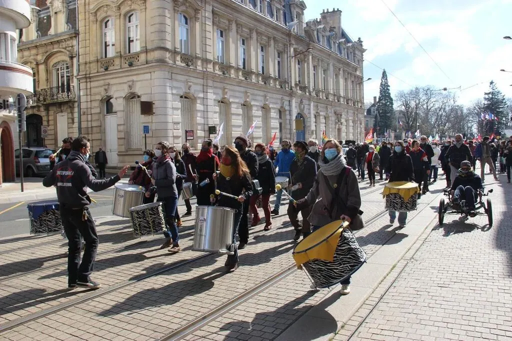 Le Mans, samedi 20 mars 2021. Le cortège entre la préfecture et les Quinconces était guidé par une batucada. © Le Maine Libre