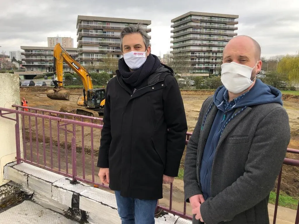 Richard Fournier, directeur artistique du pôle régional cirque Le Mans et Michaël Guihard, adjoint au maire du Mans, délégué à la Jeunesse et à l’Éducation artistique, référent de la cité du cirque, posent devant le chantier du futur chapiteau permanent aux Sablons. © Photo Le Maine Libre
