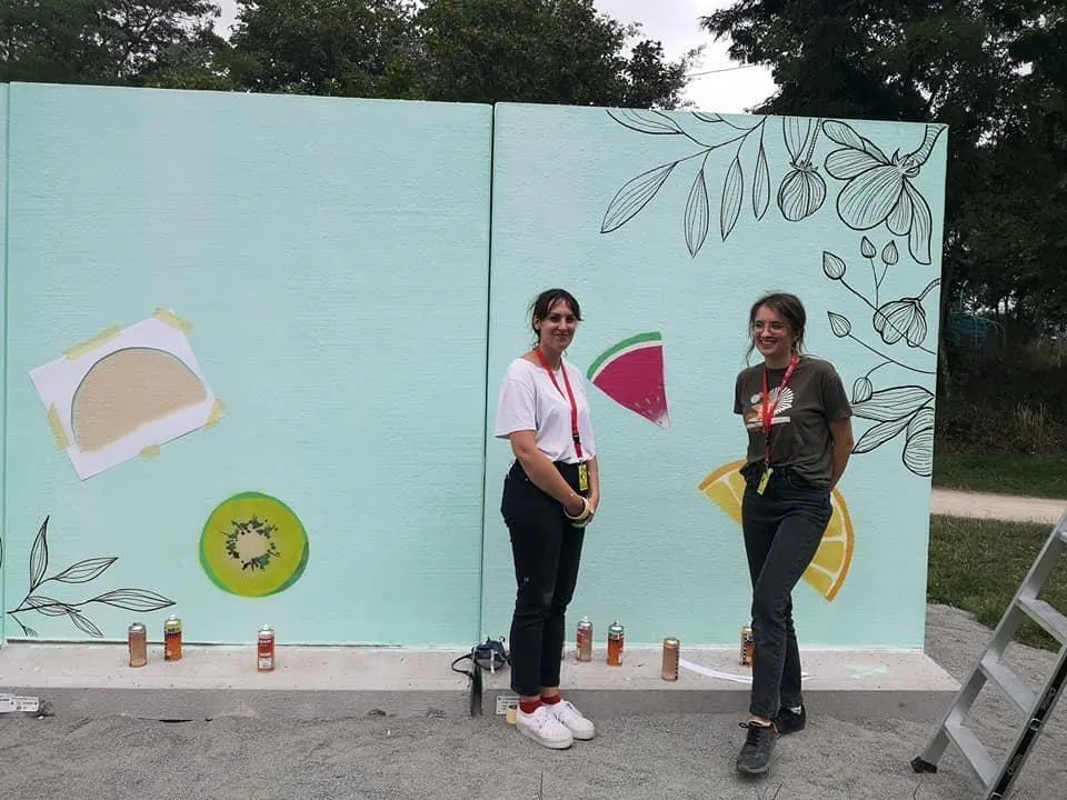 La fresque des Mancelles Mathilda et Laura, membres de Mojito Fraise en cours d’élaboration au Gué-de-Maulny. © Le Maine Libre