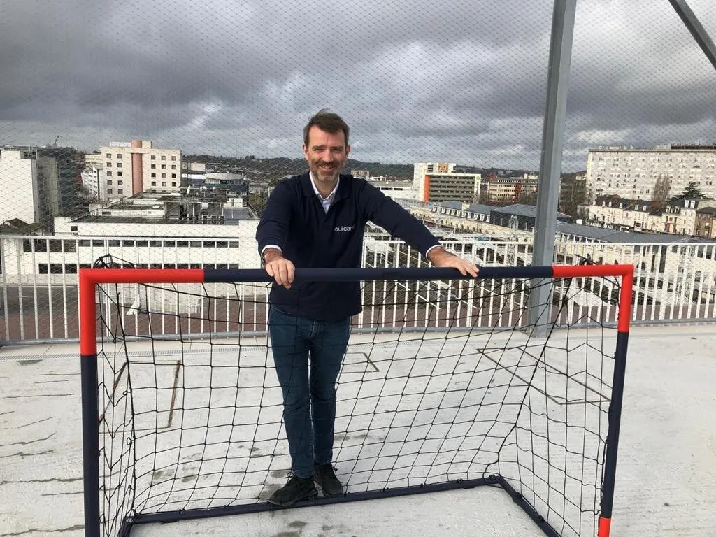Guillaume Richard, fondateur du groupe Oui Care, sur le toit, au 6e étage de son nouveau siège social. Sur le terrain qui n’attend plus que sa pelouse synthétique, les salariés pourront jouer au foot et au basket. © Ouest-France