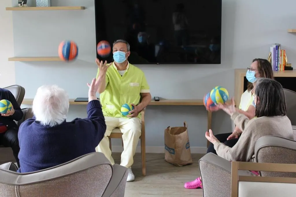 Guillaume Bouley, assistant de soins en gérontologie anime ce mercredi 21 avril 2021 un atelier de gymnastique douce adaptée en compagnie de sa collègue dans la salle principale de la maison d’accueil des Boutons d’Or. Cet atelier de gymnastique adaptée est l’occasion de solliciter les muscles, de stimuler les réflexes mais également la mémoire et l’activité cérébrale en général
