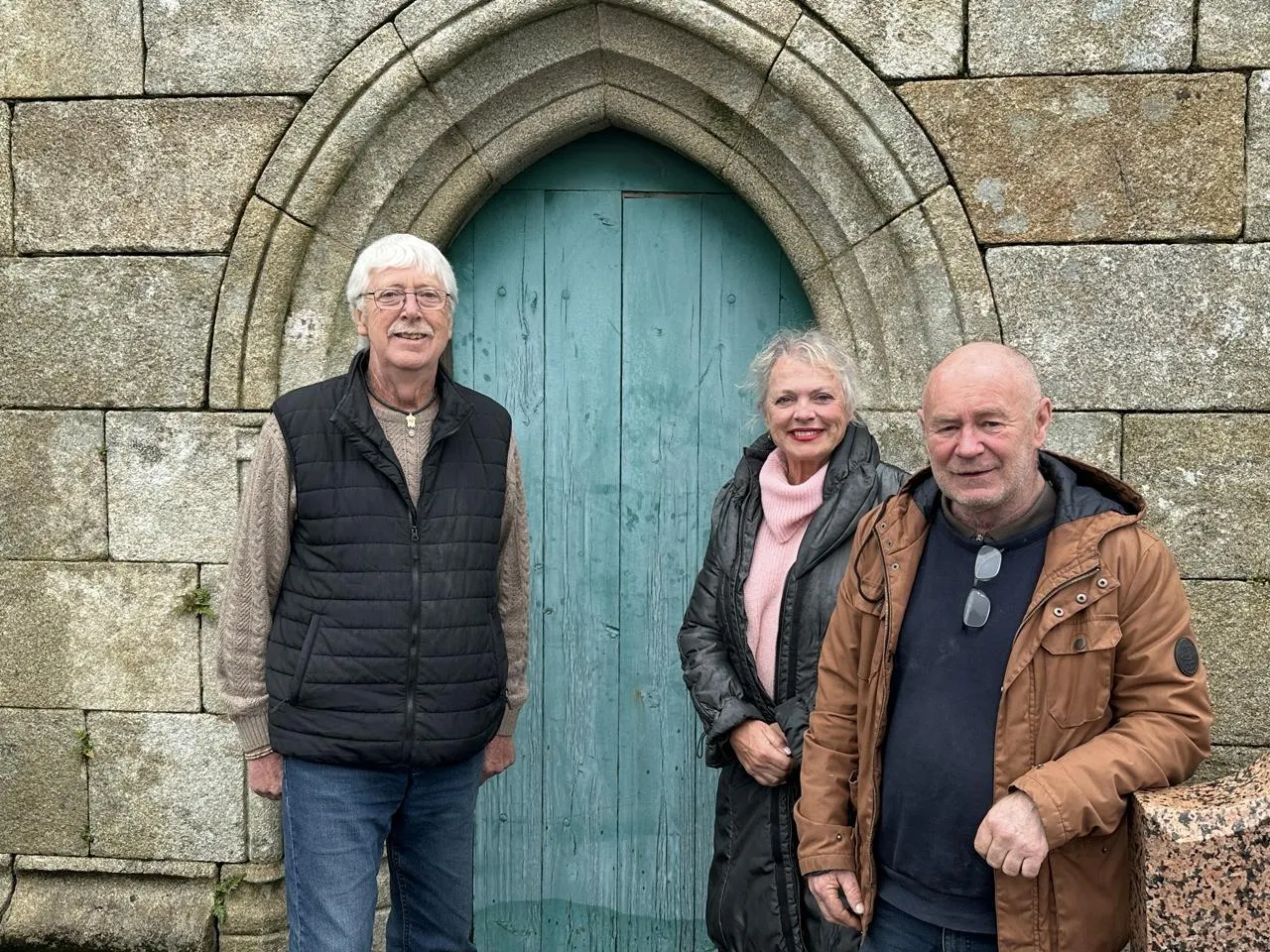 Claude Lozac’h, maire (à droite), avec Robert et Catrine Unger qui lui ont remis un don de 500 € effectué par Paul et Samantha Anderson pour restaurer la porte sud de l’église dans laquelle ce couple américain s’est marié l’an dernier. © Ouest-France
