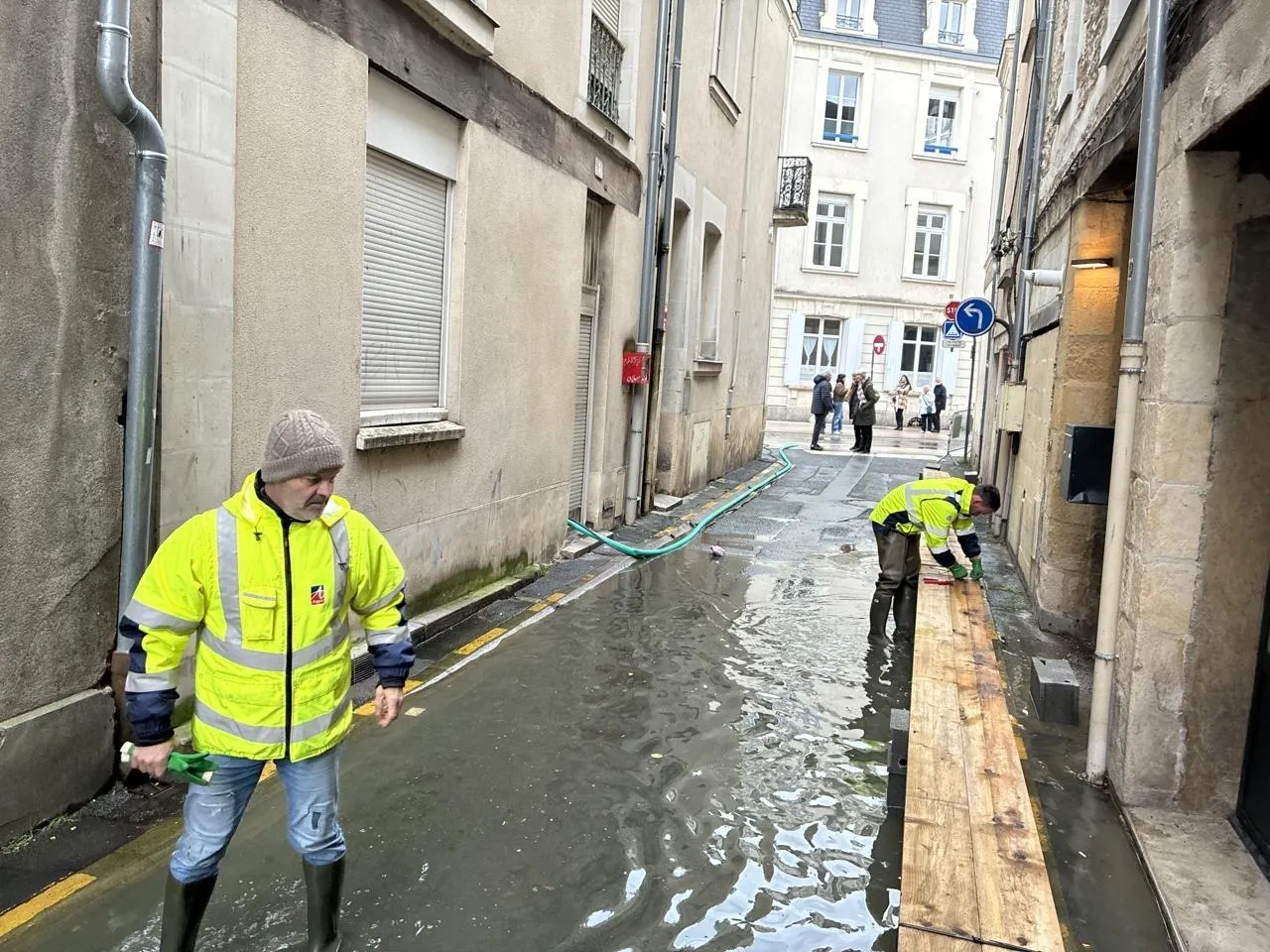 Depuis plusieurs jours et encore plus ce jeudi 19 février, avec l’arrivée de l’eau à Angers (Maine-et-Loire), les agents de la voirie sont pleinement mobilisés pour installer des parpaings et des bastaings dans les rues.