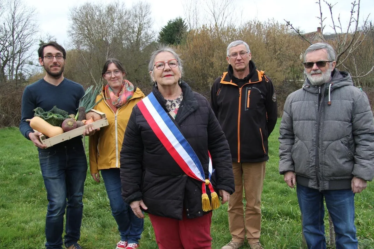 photo  de gauche à droite : pierre renouf et léa louvet, maraîchers, chantal buin, maire de tresson, jean-luc coulon et michel serpin, de la ciap 72 (coopérative d’installation en agriculture paysanne).  ©  ouest-france. 1