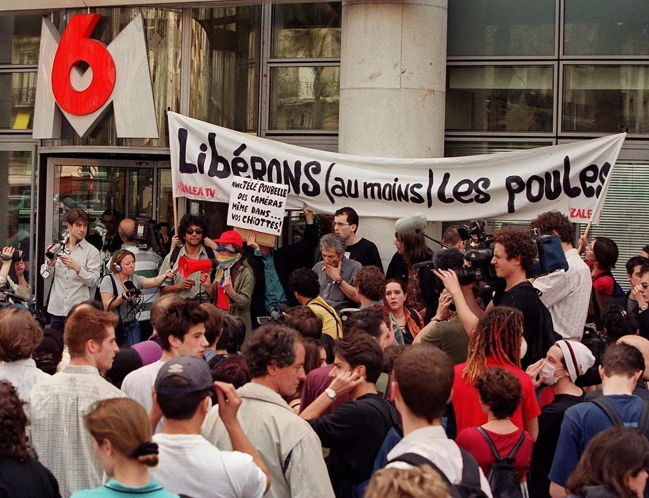 Des manifestants sont rassemblés, le 12 mai 2001, devant le siège de M6, à Neuilly-sur-Seine, pour dénoncer la diffusion de l’émission Loft Story qui fait exploser l’audience de la chaîne de télévision.  © Photo : Pierre Andrieu/AFP