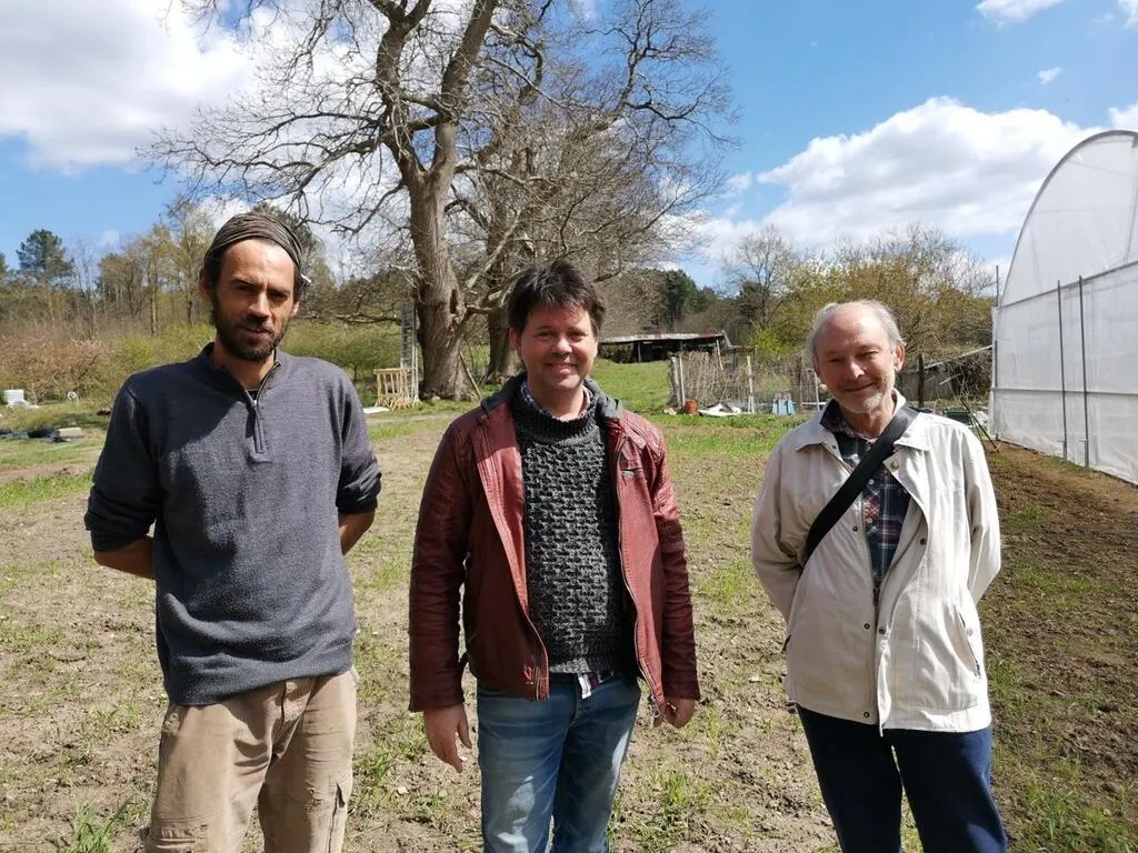 De gauche à droite : Hugues Rivière, maraîcher ; Thomas Pascal, président de l’Amap de Mayet ; Philippe Tessier, « amapien ». © Ouest-France
