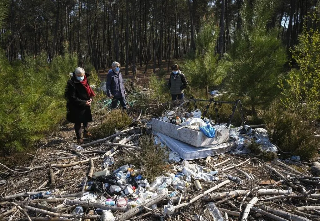 Irène Boyer, Dominique et Chantal Blossier, présidente de l’association de défense de l’environnement Grain de sable et pomme de pin constatent l’entassement de détritus : la pinède appartenant à des propriétaires privés sert de déchetterie à des personnes sans scrupule. © Le Maine Libre – Denis LAMBERT