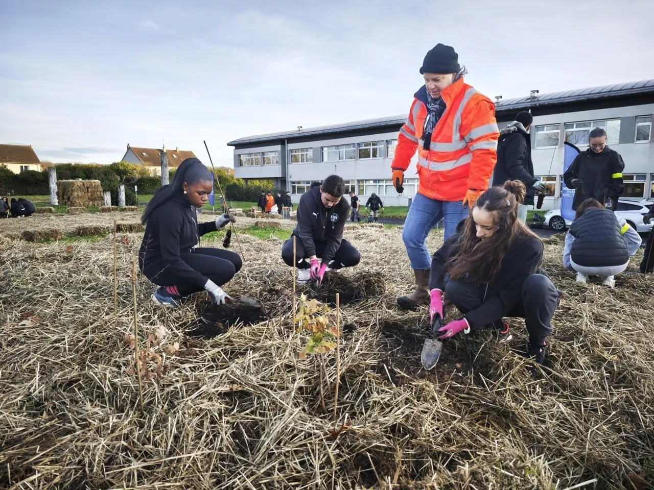 Lundi 8 et mardi 9 décembre 2025, le lycée André-Malraux d’Allonnes (Sarthe) organisait la plantation de 1 800 arbres sur un espace de 600 m² appelé « la mini-forêt d’André ». Il en restait 1 000 à planter ce mercredi 10 décembre, sur un paillage installé depuis septembre. Tout le monde était sur le pont autour de Catherine Chardonnet, professeur à l’origine du projet. 200 élèves sur les deux jours (neuf classes de seconde, première et terminale), accompagnés par l’association MiniBigForest, de l’équipe pédagogique du lycée, de deux agents de la ville et des bénévoles, se sont relayés et ont creusé la paille et le compost pour positionner correctement les jeunes plants et leurs tuteurs. 21 essences locales vont ainsi prendre racine : 216 noisetiers, 108 érables champêtres et 90 prunelliers pour les plus nombreux.