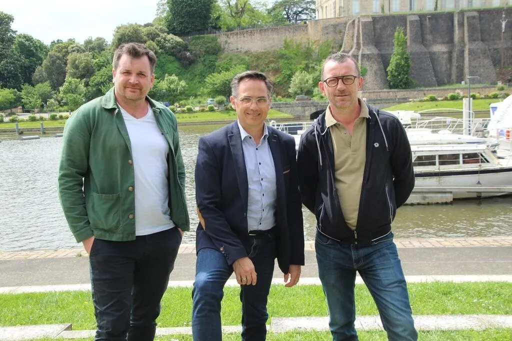De gauche à droite, Adrien Le Dréau, adjoint au commerce, Nicolas Leudière, maire de Sablé-sur-Sarthe, et Stéphane Peltier, conseiller municipal et gérant de la crêperie Chez Mam’s annoncent le lancement de guinguettes en centre-ville. © Le Maine Libre