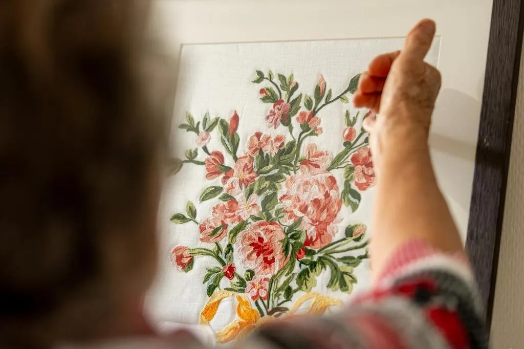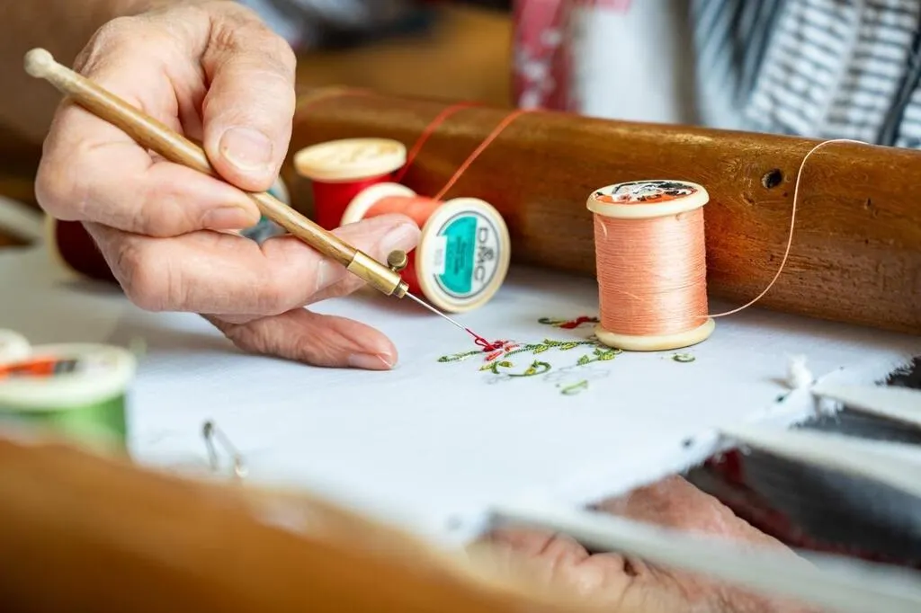 Bourg-le-Roi, samedi 13 juillet 2024. ?Odile Racinet brode depuis qu’elle est entrée à la maison Boulard, il y a 74 ans. L’entreprise de Bourg-le-Roi a disparu en 1968, mais le musée du point de Beauvais entretient le savoir-faire des brodeuses. © Le Maine Libre - Xavier SARRAT