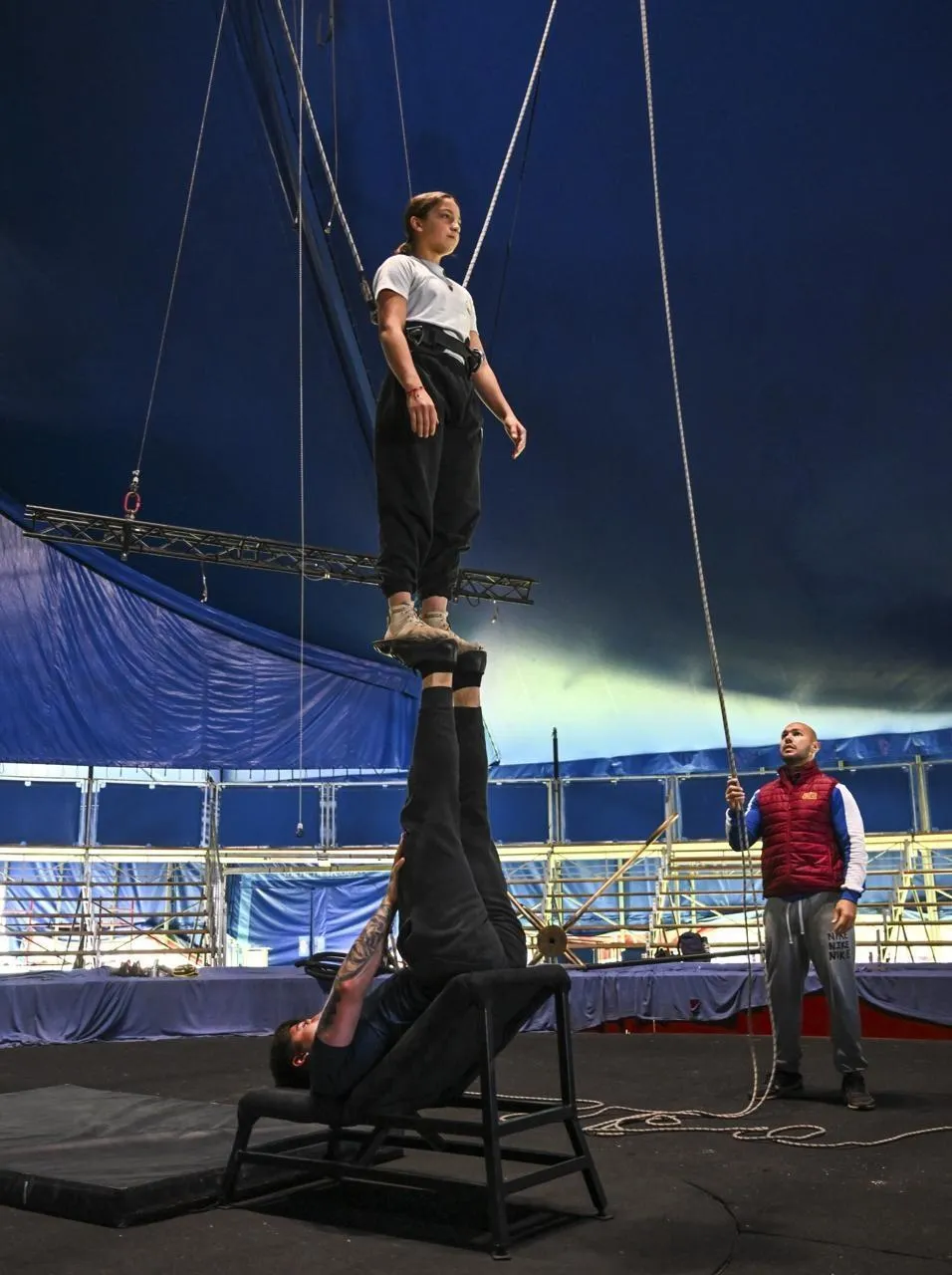 Alexis Gruss, 14 ans, petite-fille d’Arlette Gruss, évolue au trapèze sous le regard admiratif de Georgika et AbyGaëlle Kobann. © Le Maine Libre - Denis LAMBERT