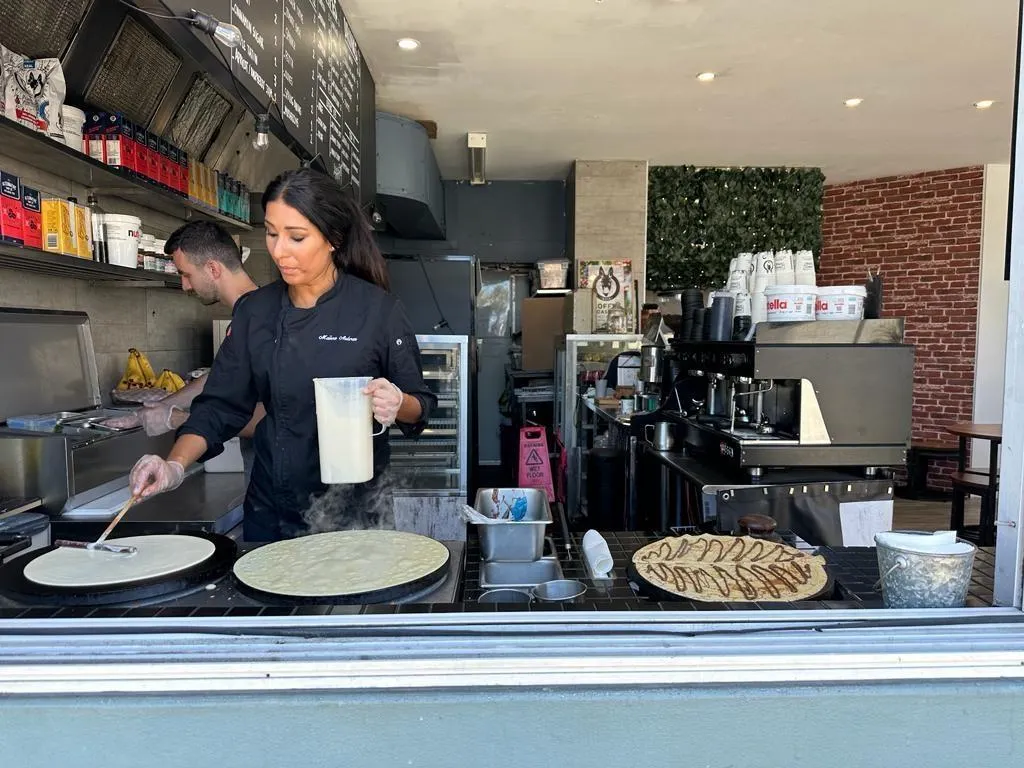 Maëva Aubras aux fourneaux de sa crêperie à Bondi Beach, à Sydney en Australie, en 2023. © Maëva Aubras