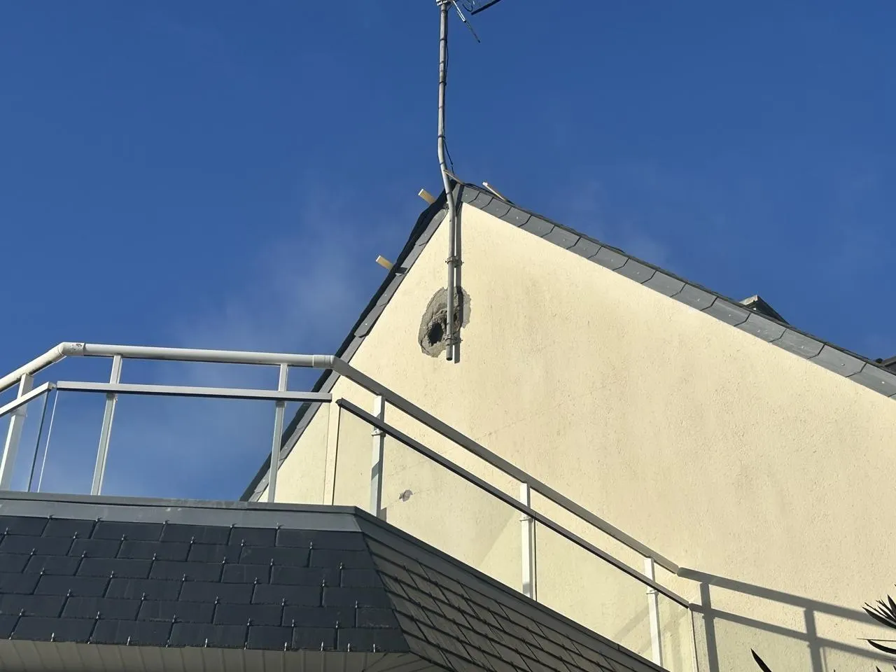 En fin d’après-midi, Denis Perrio, accompagné de plusieurs amis, était encore au pied d’œuvre pour déblayer les gravats et faire quelques valises. On en profite pour faire le tour du propriétaire, où l’on constate un immense trou dans le plafond du premier étage et un autre sur la façade, à l’extérieur, à côté de l’antenne.