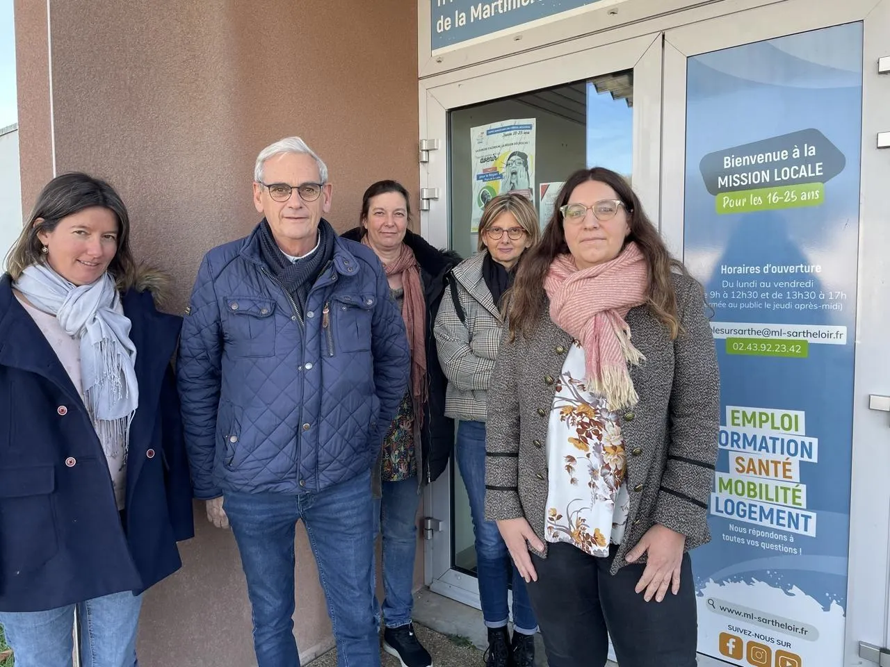 Eric David en compagnie d’Aurélie Albot (à droite) avec des salariées de la Mission locale de Sablé. © Le Maine Libre