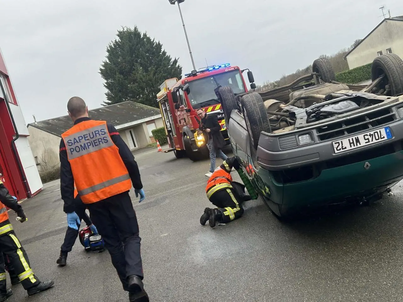 La thématique, c’est une voiture, seule, qui a fait des tonneaux et qui a fini sa course sur le toit. À l’intérieur on a une jeune personne de 21 ans qui présente des douleurs aux niveaux cervical et dorsal, estimés à 8/10 pour la douleur. On doit la sortir dans l’axe au maximum pour éviter la propagation au rachis et lui laisser le moins de séquelles possible. Dans le scénario, les portes ne s’ouvrent pas