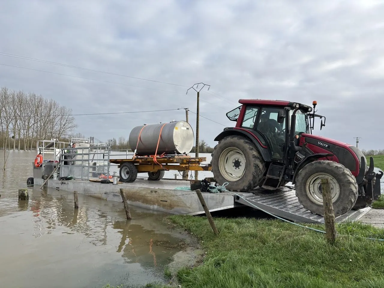 Damien Epaudry au pilotage du bac qui lui permet de transporter sa citerne de lait jusqu’à la route où l’attend le camion du laitier. © Ouest-France