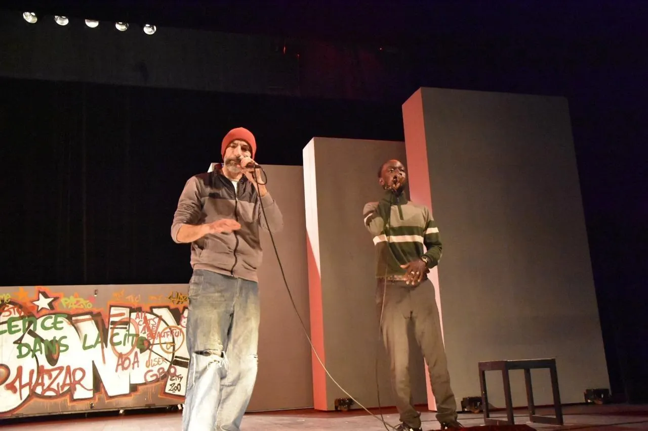 Fabien Jouatel alias O’Slim en compagnie de Djibril, un des acteurs de la pièce de théâtre mise en scène par Nicolas David de la Houlala Cie. © Alwena Gouraud