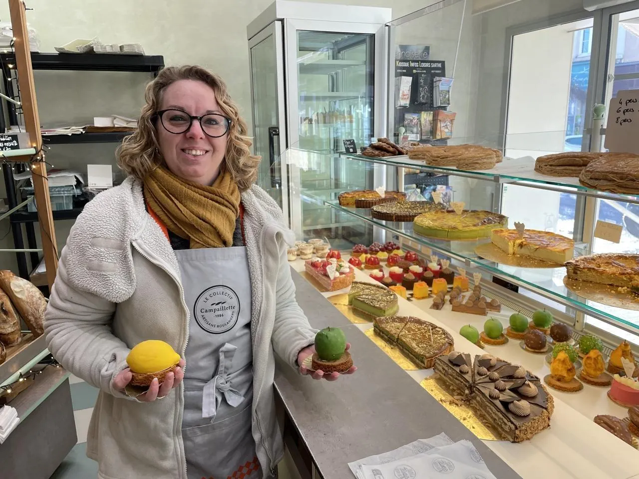Aurore, ici avec des pâtisseries en forme de fruits en trompe-l’œil, travaille à La corbeille à pains depuis 14 ans. © Le Maine Libre