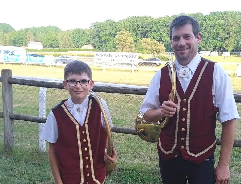 Sonneur de trompe de chasse, Thomas Chambrier, de Bouloire (Sarthe), partage sa passion avec son fils Nicolas, 11 ans.