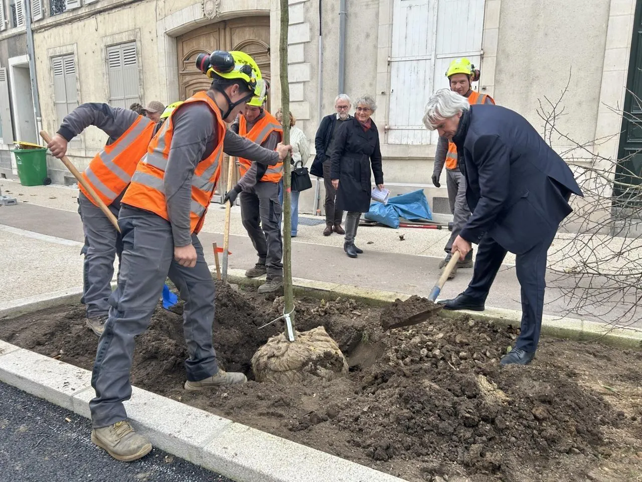 Le Mans, vendredi 14 novembre 2025. Le maire Stéphane Le Foll, pelle en main, a rappelé son engagement de planter « plus de 1 000 arbres par an » depuis le début de son mandat. © Le Maine Libre