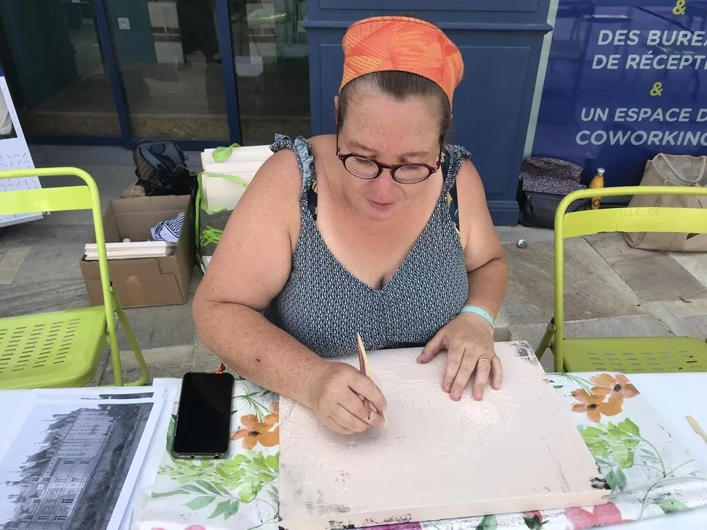 L’atelier Grav’Loir permet à des personnes non initiées aux arts de pratique la gravure en s’inspirant de paysages locaux, comme ici ce jeudi 1er août 2024 place Henri-IV à La Flèche. © Le Maine Libre