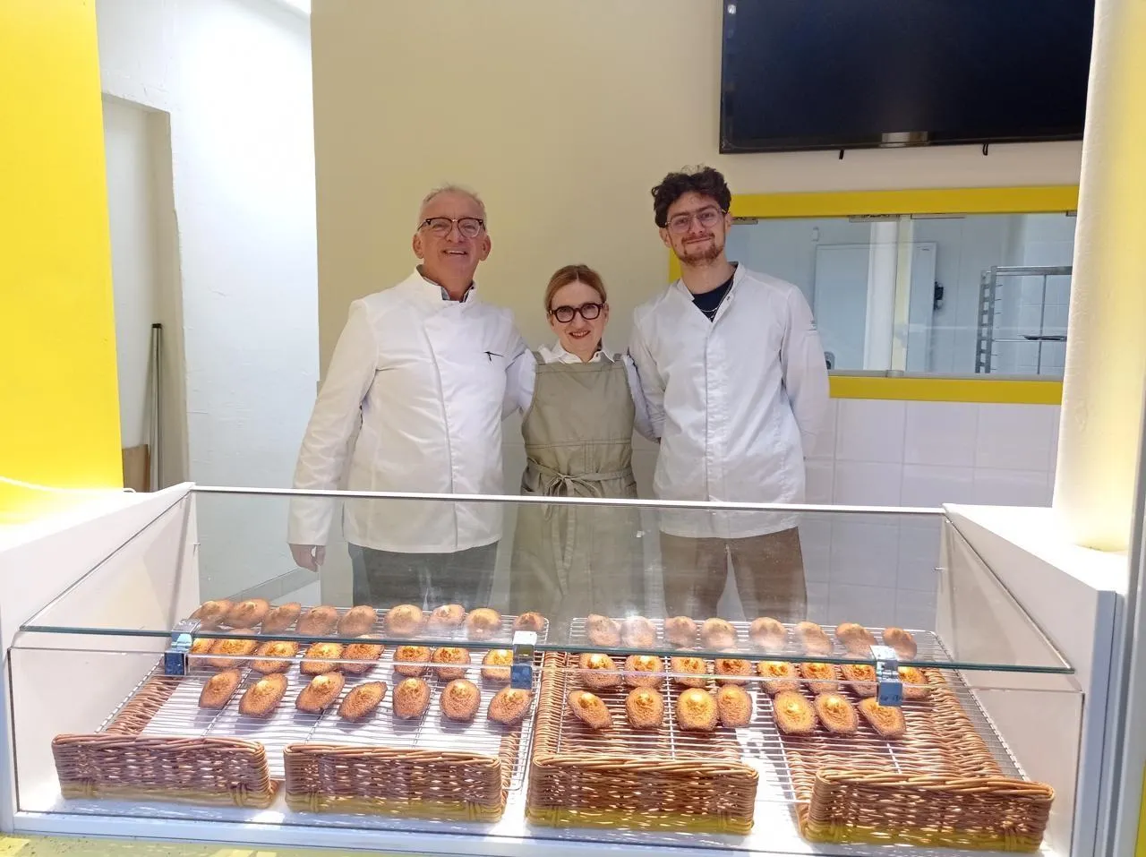 Isabelle et Loïc Bessin avec Mattéo Tomazo, leur pâtissier, sont impatients de proposer leurs madeleines au Sarthois dès le mercredi 14 janvier 2026. © Ouest-France