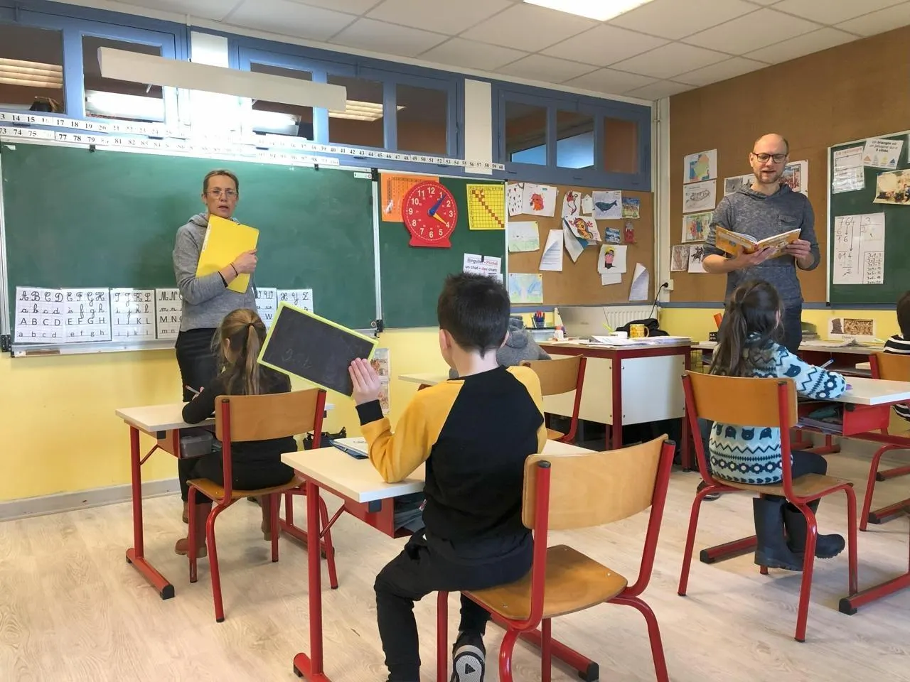Nicolas Buaillon, directeur de l’école, fait la classe avec Maryannick Le Cam, agente territoriale spécialisée des écoles maternelles (Atsem). En septembre 2024, l’école de Caurel était la plus petite du département. © Ouest-France
