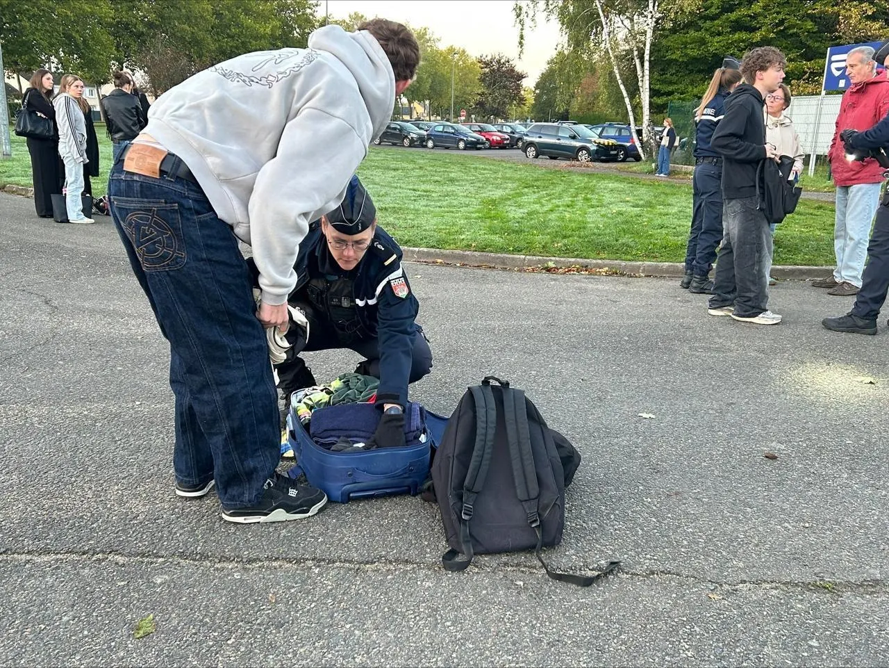 Ce lundi 6 octobre 2025, les sacs des élèves du lycée d’Estournelles-de-Constant à La Flèche (Sarthe) ont été systématiquement fouillés par les gendarmes dans le cadre d’une opération anti armes blanches. © Ouest-France