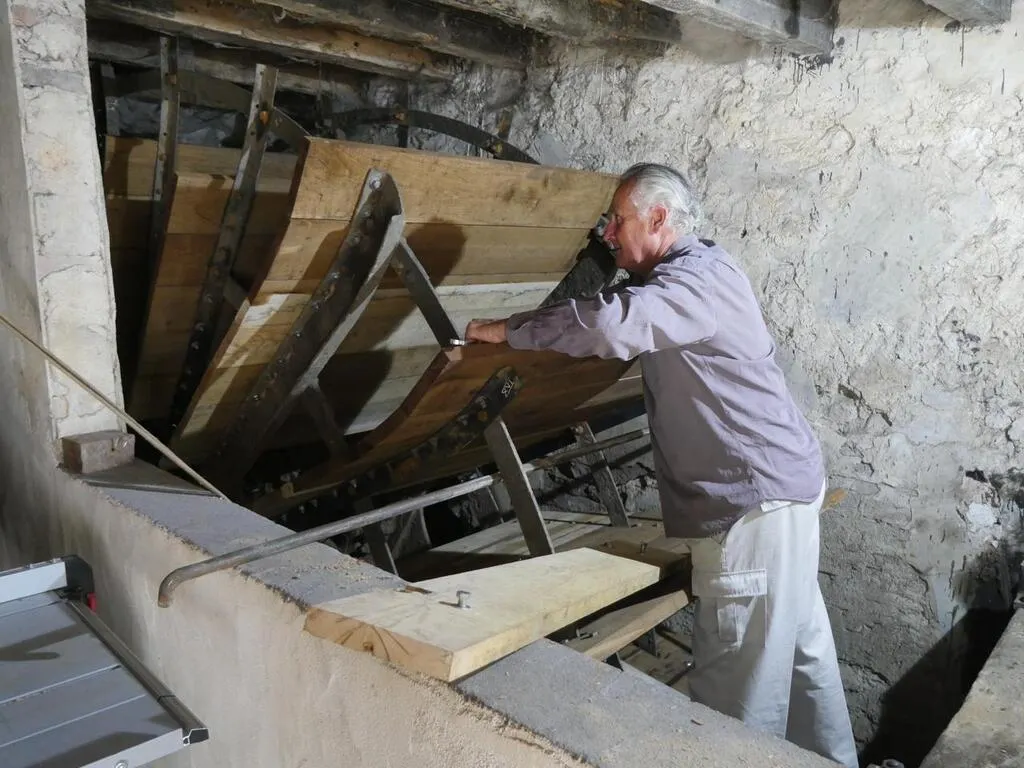 Jean-François Monnet, propriétaire avec son épouse Isabelle Chiaramonti-Monnet du moulin de Parcé-sur-Sarthe depuis 11 ans, s’affaire à la restauration de la roue. © Le Maine Libre