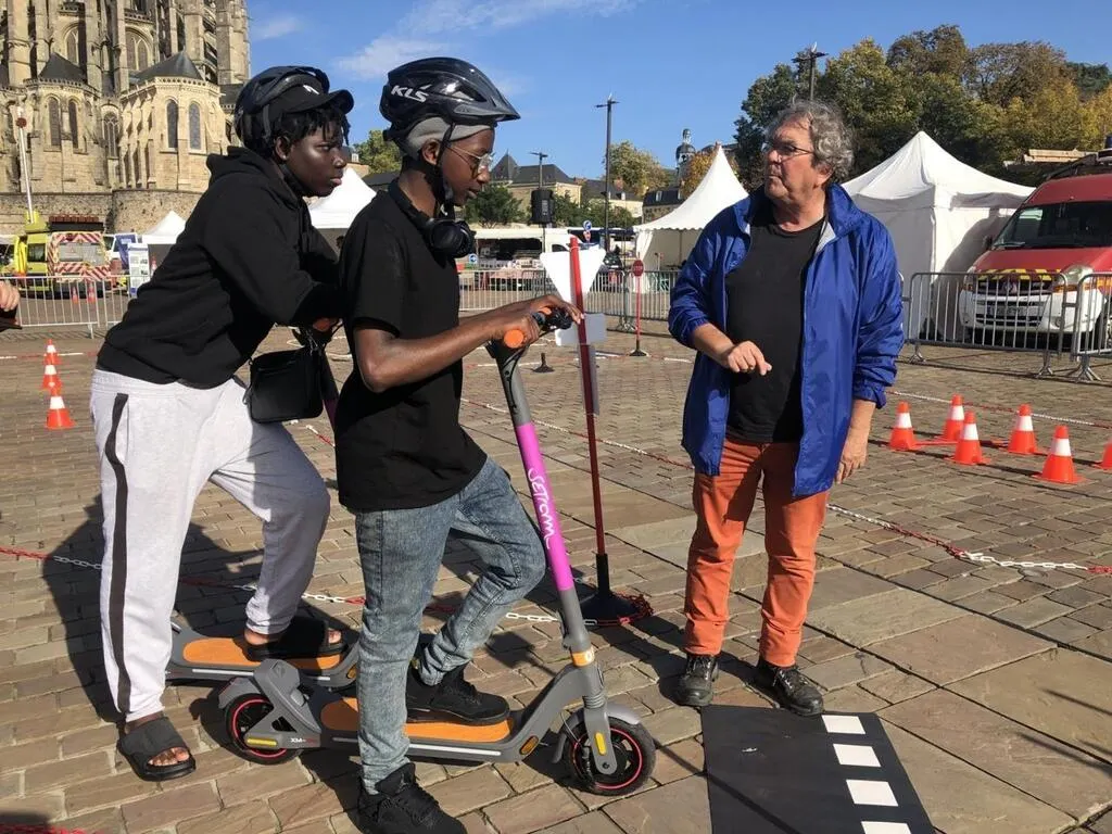 « Roule bien à droite, pour prendre le tournant. » Veste bleue estampillée Prévention routière de la Sarthe sur le dos, Bruno Lericolais distille ses conseils, en ce mercredi 16 octobre 2024, sur l’esplanade des Jacobins, au Mans (Sarthe). Au guidon d’une trottinette électrique, Nasser, 17 ans, zigzague sur le parcours aménagé à l’occasion de la Journée de la Prévention routière.