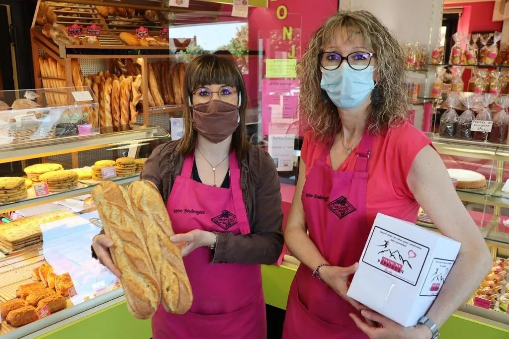Nadège Vaupré (à droite), gérante de la boulangerie Les P’tits ponts, et l’une de ses deux vendeuses, Sonia, font la promotion de leur initiative auprès de leur clientèle. © Ouest-France