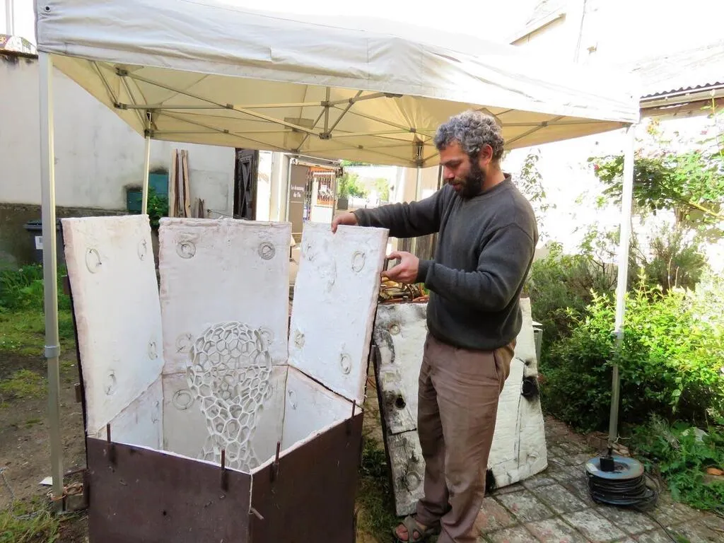 Quand il ne sillonne pas l’Hexagone avec son équipement, Mathieu Duval, 39 ans, sculpteur céramiste, partage un atelier avec quatre potiers à Saint-Jean-la-Poterie (Morbihan). Au fil des saisons, il embarque son chien Mistral et son équipement pour poser son atelier au hasard des vents.