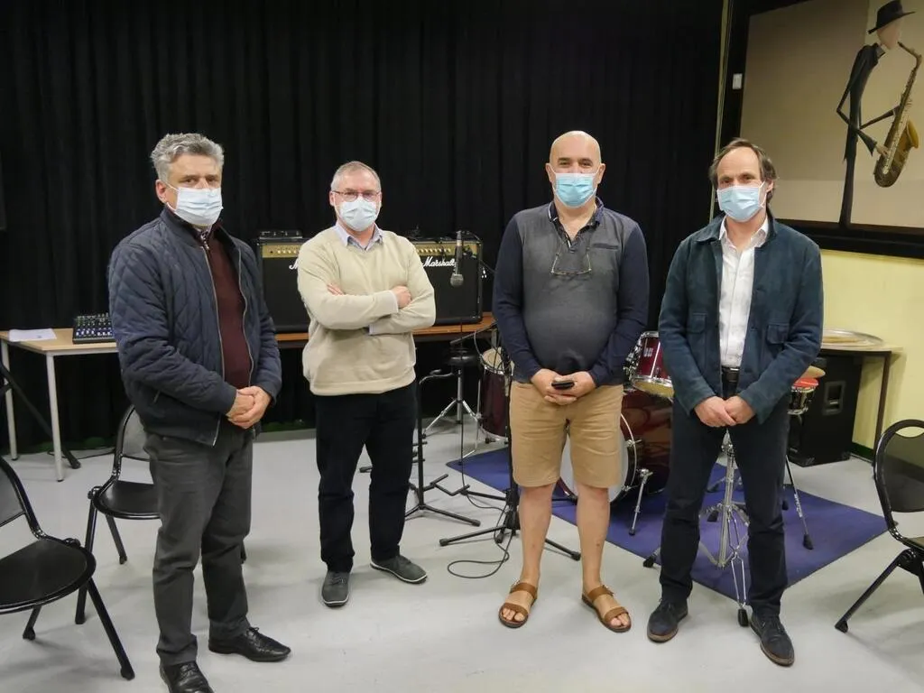 Gilbert Brothier, pharmacien, Jean Fréville, médecin, Jean-Francis Pelissier, infirmier et Eric Eouzan, médecin, tous membres du comité de gestion de la Maison de santé pluriprofessionnelle (MSP) de Sablé-sur-Sarthe. Réunis jeudi 20 mai 2021, ils craignent un amenuisement de l’offre médicale avant une possible disparition. © Le Maine Libre