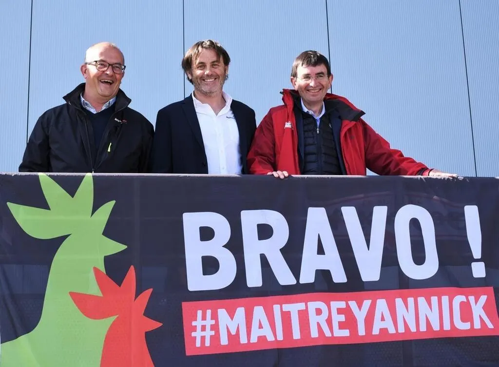 À Sablé-sur-Sarthe, des salariés ont fait signer des posters pour marquer la venue du vainqueur du Vendée Globe, Yannick Bestaven, naviguant sous les couleurs de Maître Coq. © Le Maine Libre