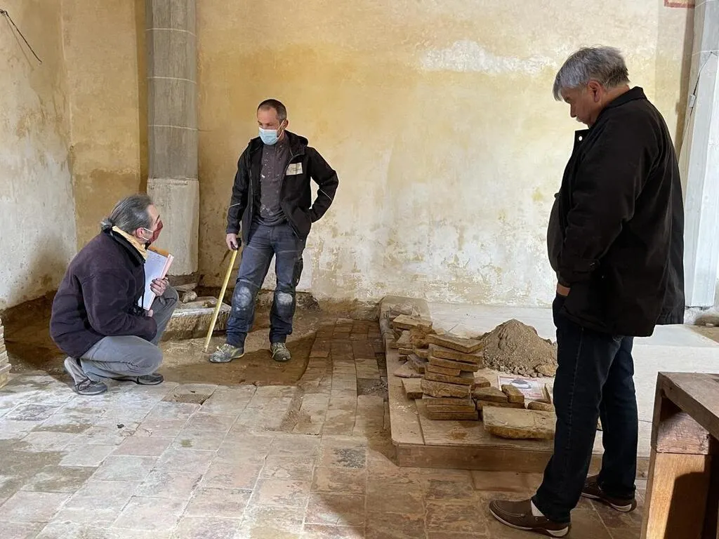 La priorité ce jour-là : décider quoi faire du carré de carrelage médiéval découvert à l’entrée de l’église, plus bas que le niveau actuel du plancher et plus petit que les carreaux posés dans le reste de l’église. Moi je vous propose de remettre du carrelage de cette dimension pour garder la trace de ce sol