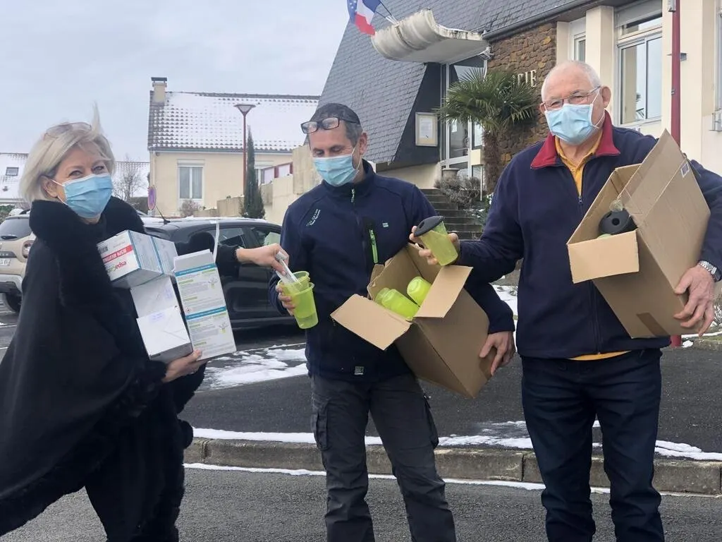 Saint-Saturnin, jeudi 11 février 2021. Yvane Montaville, ici avec Didier et Jean. Les pièges à frelons ont été livrés. La distribution a commencé. © Photo LE MAINE LIBRE