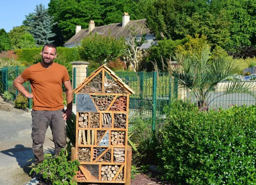 Mehdi Gallet, devant l’un des hôtels à insectes qui n’attendent plus que des résidents. © Ouest-France