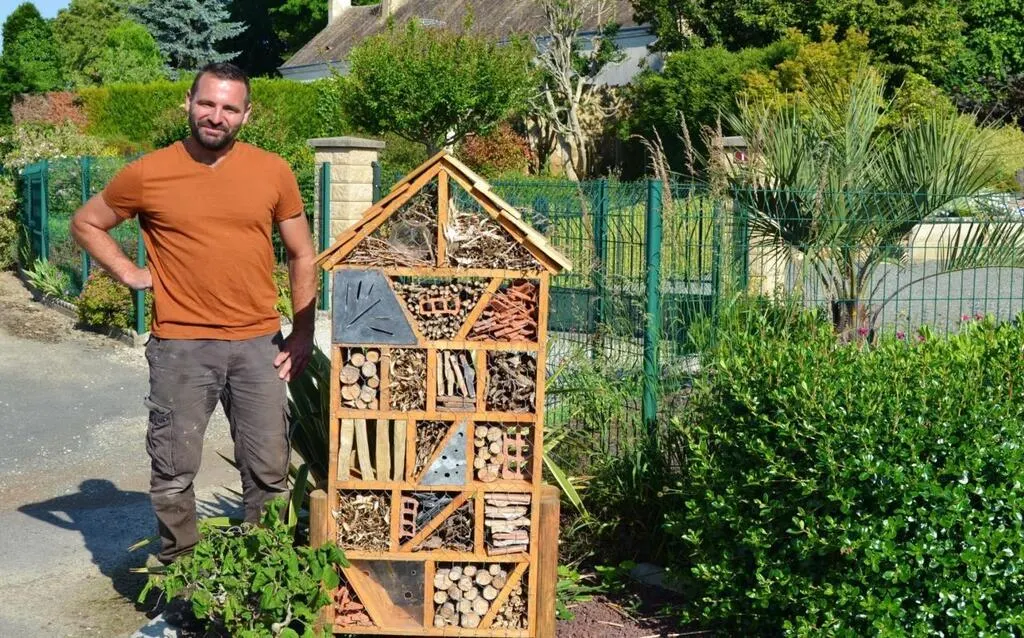 Mehdi Gallet, devant l’un des hôtels à insectes qui n’attendent plus que des résidents. © Ouest-France