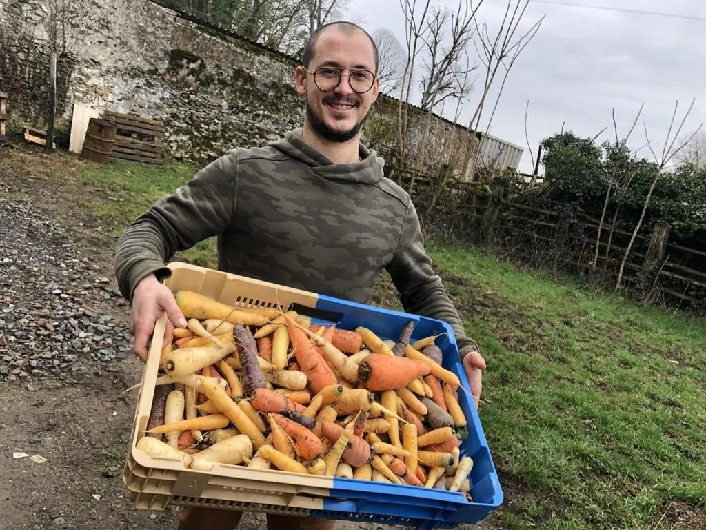 Une vingtaine de variétés de tomates, des carottes de quatre couleurs, mais aussi des choux, radis, salades, échalotes, betteraves, butternuts… Sur sa petite parcelle, Théophile Briffaut cultive une grande variété de légumes bio. Il dispose d’un hectare et demi, dont 1 000 m2 de serres, avec vue sur le clocher de Fillé-sur-Sarthe.