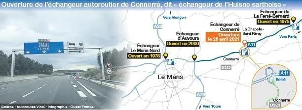 Sur l’A11, un nouvel échangeur va être mis en service ce lundi 26 avril 2021, entre Le Mans et La Ferté-Bernard (Sarthe), à hauteur de la commune de Connerré. Le projet était dans les cartons depuis… les années 1990.