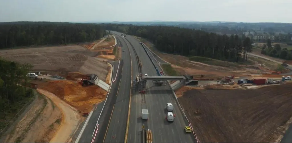 Pose des poutres sur les appuis de l’échangeur de l’Huisne sarthoise sur l’autoroute A11 en Sarthe, en mai 2020. © Vinci Autoroutes