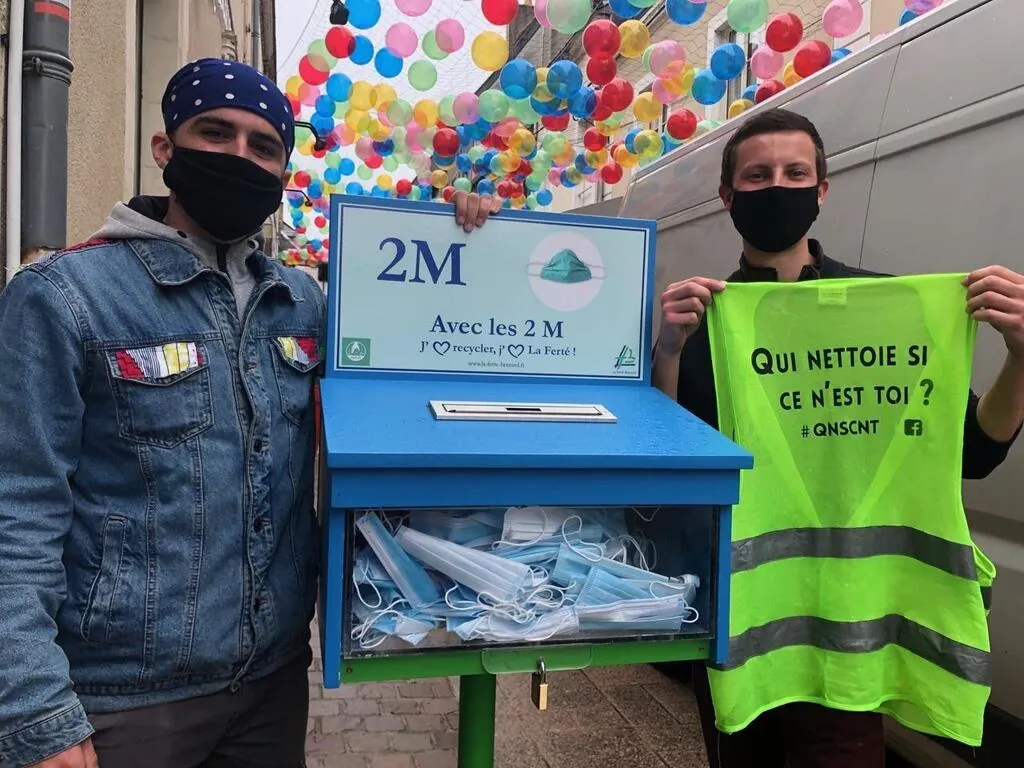 Lucien Thébault et Alexis Gits ont aussi créé les urnes « 2 M », pour collecter masques usagés et mégots, comme ici en centre-ville de La Ferté-Bernard. © Ouest-France