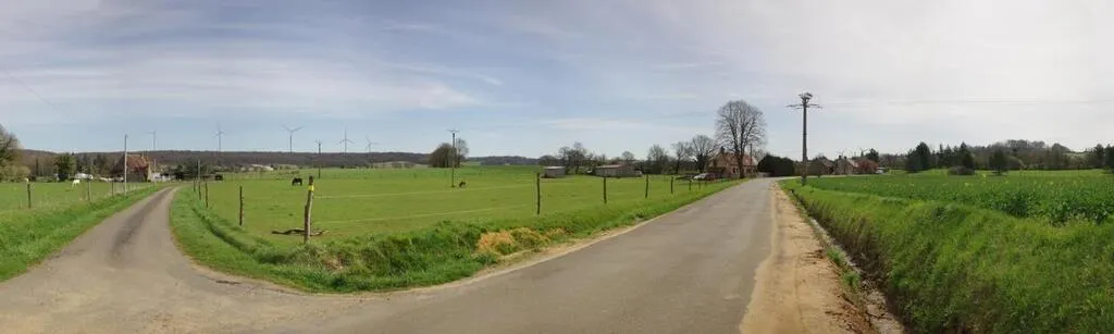 Photomontage d’un panorama permettant de voir l’intégralité du parc éolien, depuis Coudrecieux. © JPee.
