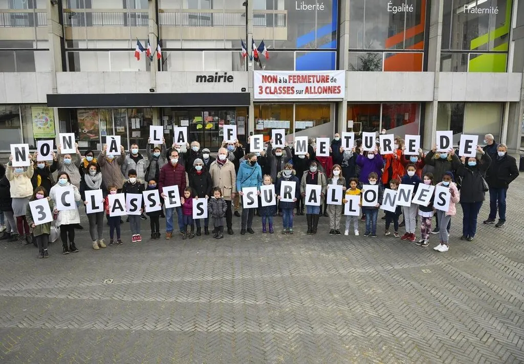 Parents, enseignants, élèves et élus se sont retrouvés mercredi en fin d’après-midi. Ils refusent la fermeture de trois classes à Allonnes. © Photo Le Maine Libre – Yvon LOUÉ