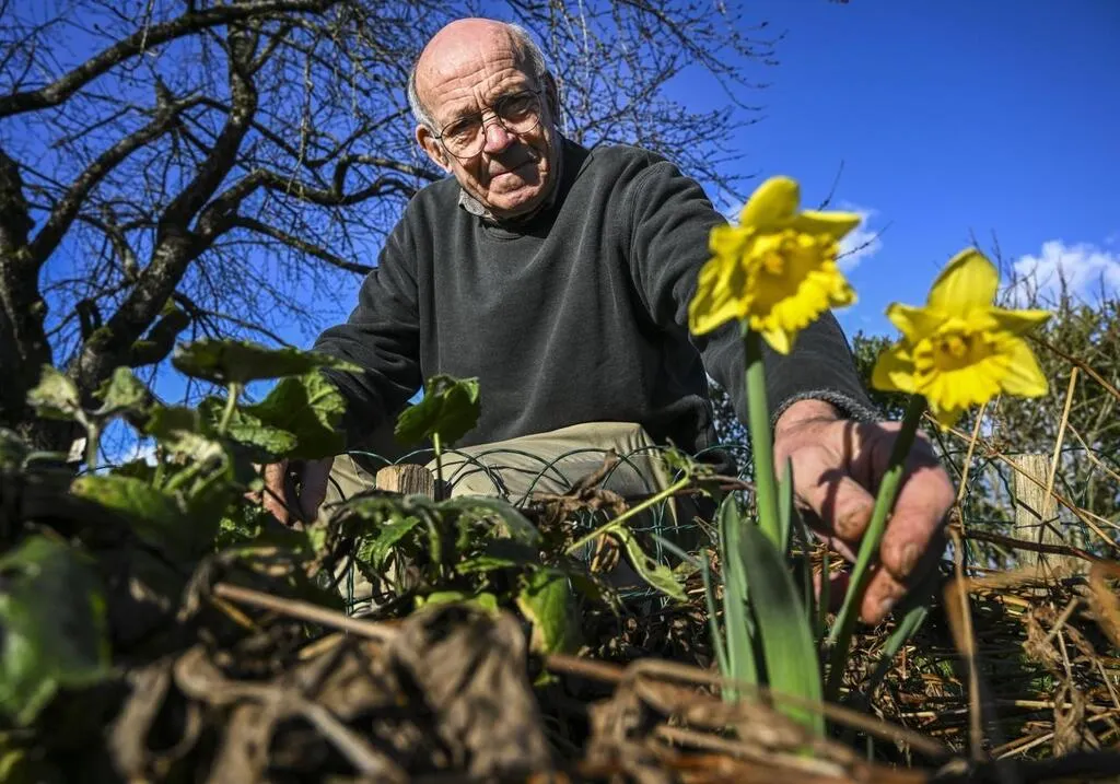 Conlie, vendredi 5 janvier 2024. Dans le jardin de Gilbert Courant, des jonquilles en fleurs au début de l’hiver. Du jamais vu selon lui. © Le Maine Libre-Denis LAMBERT