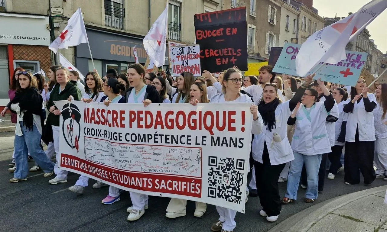 Plus de 150 étudiants de l’école de soins infirmiers de la Croix-Rouge du Mans (Sarthe) ont manifesté ce jeudi 5 mars 2026. Ils dénoncent la fermeture annoncée de leur école après l’arrêt de son financement par la Région Pays de la Loire. Ils réclament des garanties sur la suite de leur formation et l’avenir des formateurs.