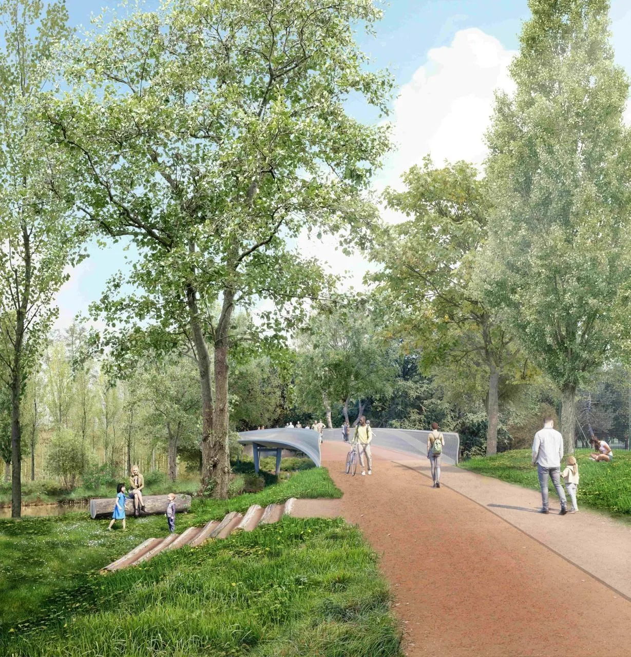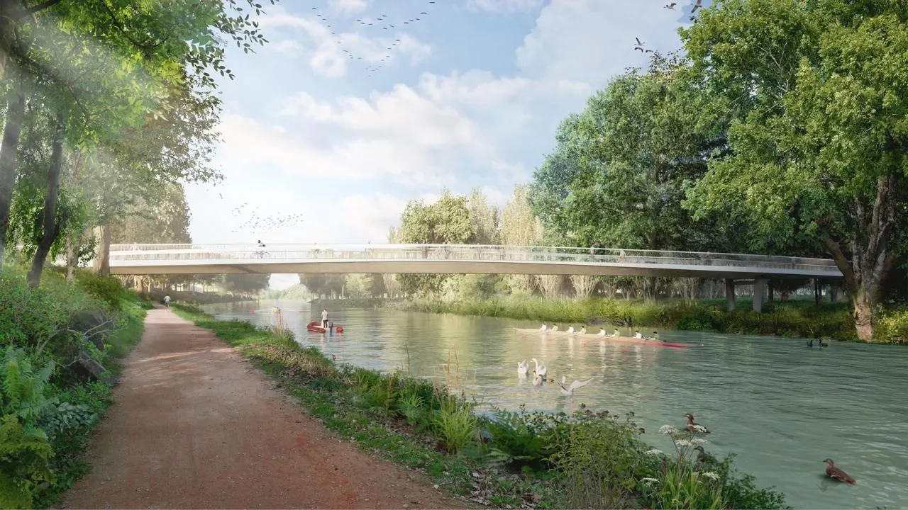 La passerelle, accessible depuis le boulevard nature rive droite (à gauche sur l’image), devait enjamber la Sarthe sur 60 mètres et être prolongée par une estacade de 250 mètres dans une zone humide et boisée, rive gauche (à droite sur l’image). © Agence AEI – Lalu – Arcadis – Noctiluca