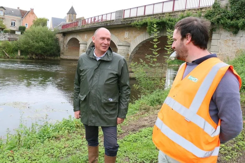 Frédéric Beauchef, président de la commission Infrastructures routières, et Bryan Furon, chef du bureau ouvrages d’art, devant le pont reliant Sainte-Jamme-sur-Sarthe à Montbizot. © OUEST-FRANCE.